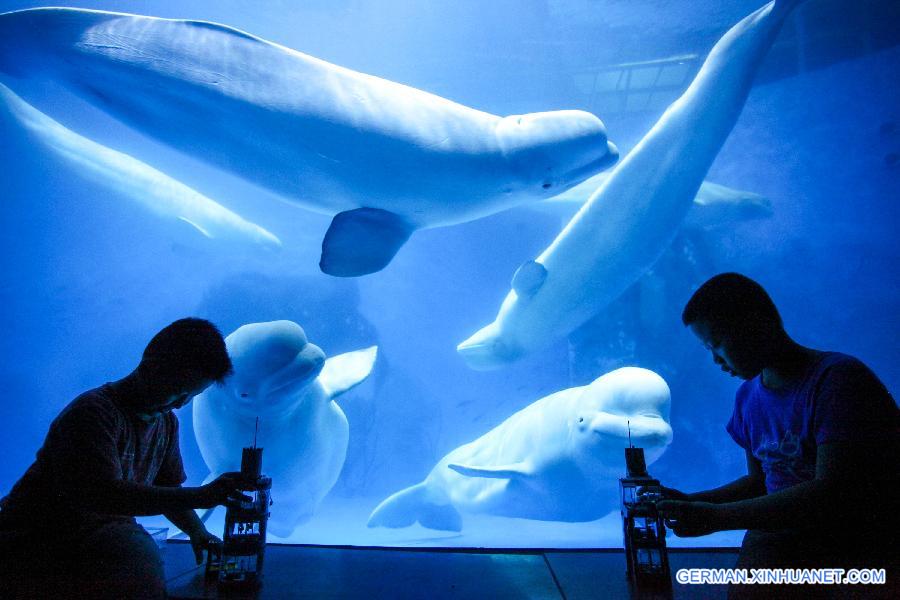 Touristen schauen am 1. August 2015 im Polar Aquarium in Tianjin in Nordchina Fische an. Touristen können Nacht im Äquarium verbringen, um die Nachtaktive Tiere zu beobachten. (Xinhua/Li Xiang)