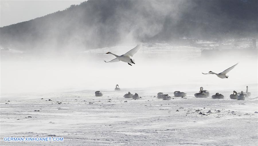 #CHINA-SHANDONG-RONGCHENG-SWANS (CN)RONGCHENG, 25. Januar 2016 (Xinhuanet) -- Schwäne auf dem gefrorenen Schwansee in der Stadt Rongcheng, der ostchinesischen Provinz Shandong, 24. Januar 2016. (Quelle: Xinhua/Wang Fudong)