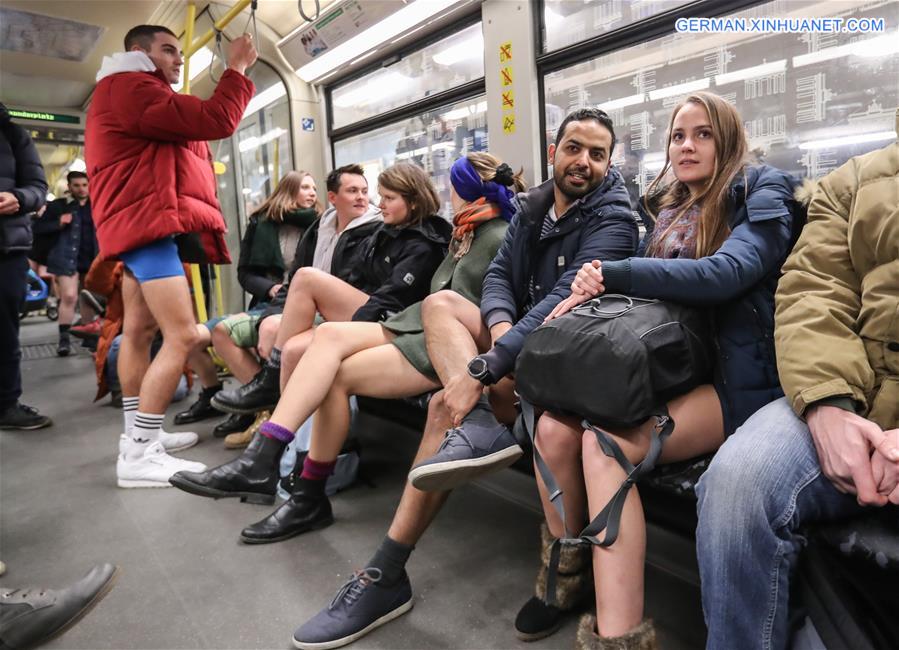 BERLIN, 7. Januar 2018 (Xinhuanet) -- Teilnehmer der Keine Hosen U-Bahnfahrt Berlin 2018 in einer U-Bahn in Berlin, der Hauptstadt Deutschlands, 7. Januar 2018. (Quelle: Xinhua/Shan Yuqi)