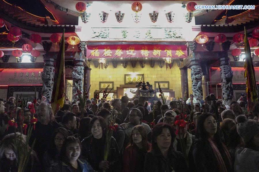 LOS ANGELES, 16. Februar 2018 (Xinhuanet) -- Leute versammeln sich im Thien Hau-Temple zur Feier des ersten Tages des chinesischen Mond-Neujahrs in Los Angeles, den Vereinigten Staaten, 16. Februar 2018. (Quelle: Xinhua/Zhao Hanrong)
