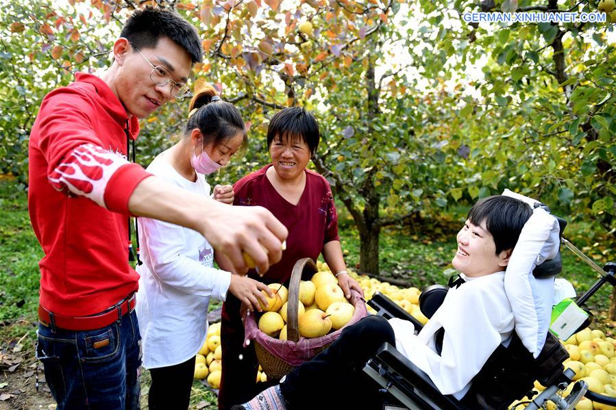 HEFEI, 24. Oktober 2019 (Xinhuanet) -- Li Juan und ihre Familie sind im Birnengarten im Dorf Tangzhai der Gemeinde Tangzhai im Kreis Dangshan in der ostchinesischen Provinz Anhui zu sehen, 23. Oktober 2019. Li Juan, 30, hält einen Stift im Mund, kommuniziert mit Kunden und Zustellern und aktualisiert die Informationen in ihrem Online-Shop über das Mobiltelefon. All dies sind die hauptsächlichen Arbeiten, die Li Juan als Managerin eines E-Commerce erledigt. Im Jahr 2008 wurde Li Juan krankheitsbedingt gelähmt, nur ihr Kopf konnte sich bewegen. 2015 bekam sie ein Touchscreen-Telefon und lernte bald, landwirtschaftliche Produkte im Internet zu verkaufen. In der Erntesaison 2015 gelang es ihr, rund 5 Tonnen Äpfel für ihre Familie zu verkaufen. Bisher hat Li Juan ein Geschäft gegründet, um landwirtschaftliche Produkte für Dorfbewohner zu verkaufen. (Quelle: Xinhua/Liu Junxi)