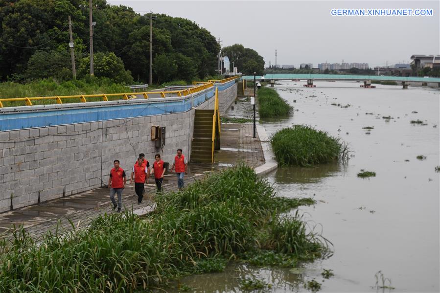 HUZHOU, 7. Juli 2020 (Xinhuanet) -- Freiwillige patrouillieren entlang eines Wasserlaufs im Bezirk Wuxing in der Stadt Huzhou der ostchinesischen Provinz Zhejiang, 7. Juli 2020. Chinas Hauptquartier für Hochwasserschutz und Dürrehilfe hat am Dienstag die Notfallreaktion für den Hochwasserschutz von Stufe IV auf Stufe III angehoben, da unaufhörliche Regengüsse in weiten Teilen des Landes weiterhin Chaos anrichteten. Das Hauptquartier sagte, es würde die lokalen Behörden anleiten, ihre Prognosefähigkeiten zu stärken, die Überwachung von Flüssen und Stauseen zu verbessern und den Lebensunterhalt der von den Überschwemmungen betroffenen Menschen zu sichern. (Quelle: Xinhua/Huang Zongzhi)