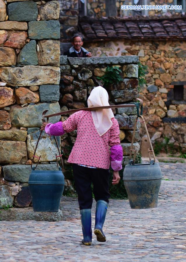 QUANZHOU, 1. Dezember 2020 (Xinhuanet) -- Eine Dorfbewohnerin geht an Steinhäusern im Dorf Zhangjiao in der Gemeinde Tuling im Bezirk Quan'gang der Stadt Quanzhou in der südostchinesischen Provinz Fujian vorbei, 1. Dezember 2020. Das Dorf Zhangjiao im nordwestlichen Berggebiet der Gemeinde Tuling bietet eine einzigartige Landschaft mit übereinander gestapelten Steinhäusern. In den letzten Jahren hat der Bezirk Quan'gang die charakteristischen Ressourcen des Dorfes Zhangjiao voll genutzt, um den ökologischen Freizeittourismus zu entwickeln und den Bau des schönen ländlichen Raums zu fördern. (Quelle: Xinhua/Wei Peiquan)