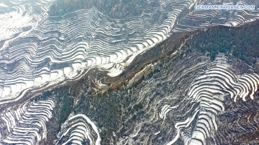 HANDAN, 2. Dezember 2020 (Xinhuanet) -- Das am 2. Dezember 2020 aufgenommene Luftbild zeigt eine Ansicht von schneebedeckten Terrassenfeldern im Kreis Shexian in Handan, der nordchinesischen Provinz Hebei. (Quelle: Xinhua/Wang Xiao)