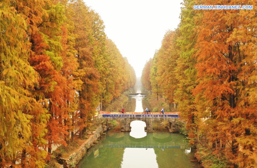 HENGYANG, 6. Dezember 2020 (Xinhuanet) -- Das am 6. Dezember 2020 aufgenommene Luftbild zeigt Radfahrer, die inmitten von Urweltmammutbäumen im Dorf Baidishi im Kreis Qidong in Hengyang in der zentralchinesischen Provinz Hunan fahren. (Quelle: Xinhua/Cao Zhengping)