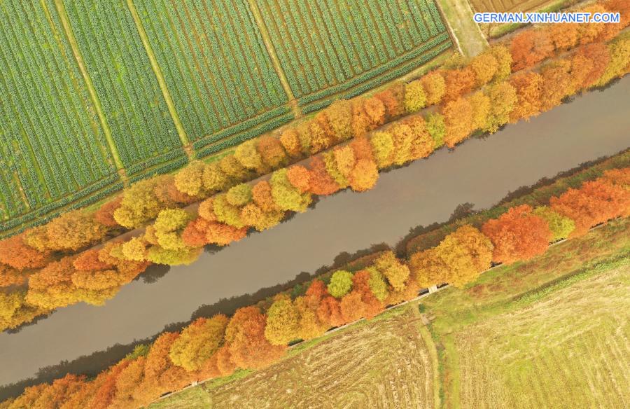 HENGYANG, 6. Dezember 2020 (Xinhuanet) -- Das am 6. Dezember 2020 aufgenommene Luftbild zeigt die Winterlandschaft von Urweltmammutbäumen im Dorf Baidishi im Kreis Qidong in Hengyang in der zentralchinesischen Provinz Hunan. (Quelle: Xinhua/Cao Zhengping)