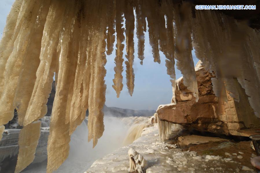 JIXIAN, 9. Dezember 2020 (Xinhuanet) -- Das am 9. Dezember 2020 aufgenommene Foto zeigt die Winterlandschaft des Wasserfalls Hukou im Kreis Jixian der nordchinesischen Provinz Shanxi. Der Wasserfall Hukou befindet sich im Grenzgebiet zwischen den nordchinesischen Provinzen Shanxi und den nordwestchinesischen Provinzen Shaanxi. (Quelle: Xinhua/Lyu Guiming)