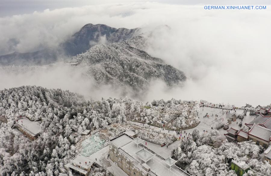 HENGYANG, 15. Dezember 2020 (Xinhuanet) -- Das Luftbild zeigt Menschen, die Spaß an dem schneebedeckten Gebirgsgebiet Hengshan in Hengyang der zentralchinesischen Provinz Hunan haben, 15. Dezember 2020. (Quelle: Xinhua/Cao Zhengping)
