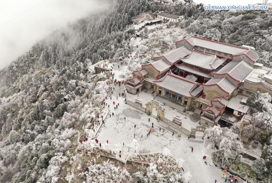 HENGYANG, 15. Dezember 2020 (Xinhuanet) -- Das Luftbild zeigt Menschen, die Spaß an dem schneebedeckten Gebirgsgebiet Hengshan in Hengyang der zentralchinesischen Provinz Hunan haben, 15. Dezember 2020. (Quelle: Xinhua/Cao Zhengping)