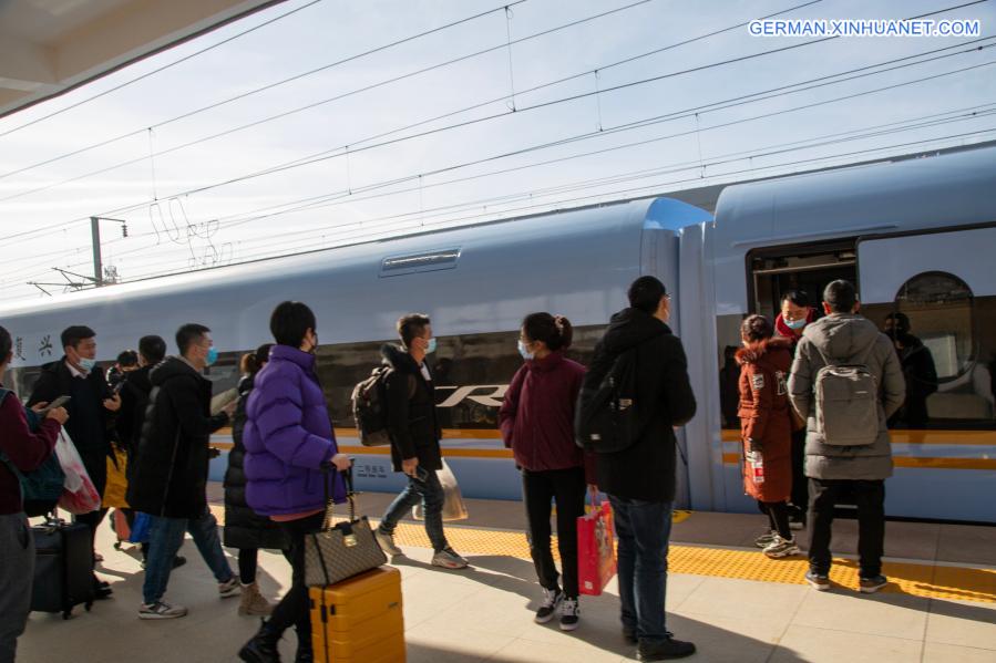 QINGYANG, 26. Dezember 2020 (Xinhuanet) -- Fahrgäste warten darauf, in einen Hochgeschwindigkeitszug am Bahnhof Huanxian, der sich entlang der Eisenbahnstrecke zwischen Yinchuan und Xi'an im Kreis Huanxian der nordwestchinesischen Provinz Gansu befindet, einzusteigen, 26. Dezember 2020. Eine neue Hochgeschwindigkeitsstrecke, die Yinchuan, die Hauptstadt des Autonomen Gebiets Ningxia der Hui, mit Xi'an, der Hauptstadt der Provinz Shaanxi, beide in Westchina, verbindet, wurde ab Samstag in Betrieb genommen. Der neue Eisenbahnverkehr wird die Reisezeit zwischen Yinchuan und Xi'an von 14 Stunden auf etwa drei Stunden verkürzen. Die 610 km lange Eisenbahn wurde mit einer Investition von 80,5 Milliarden Yuan (ca. 12,33 Milliarden US-Dollar) gebaut, und die Geschwindigkeit des Zuges ist auf 250 km/h eingestellt. (Quelle: Xinhua/Zhang Yongxin)