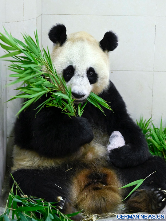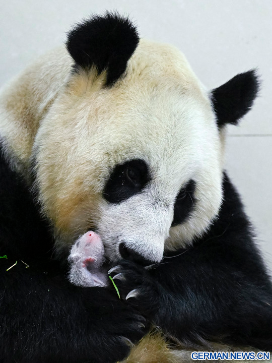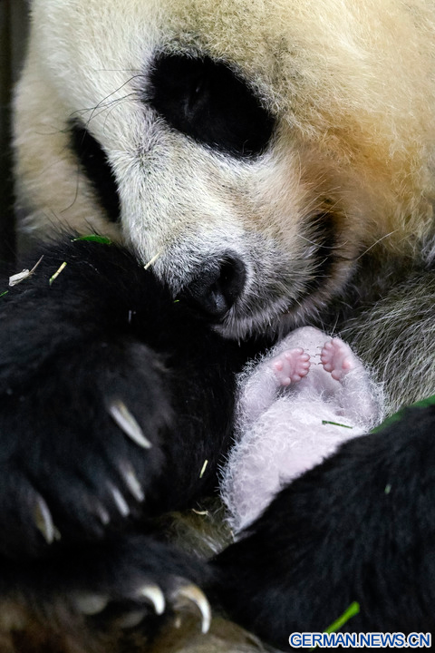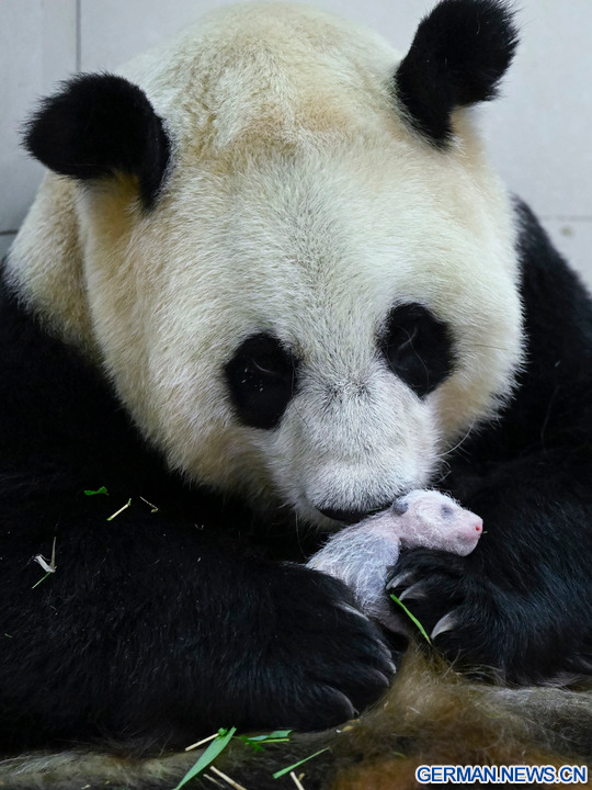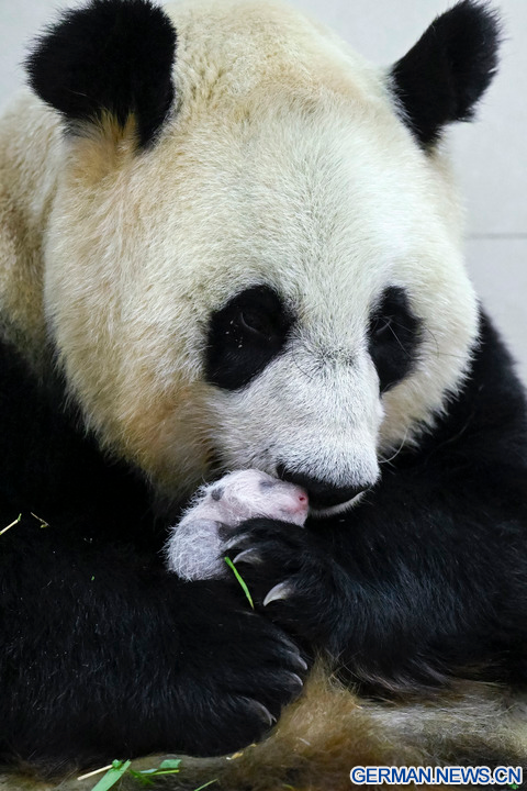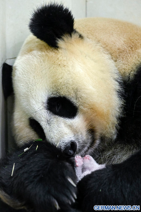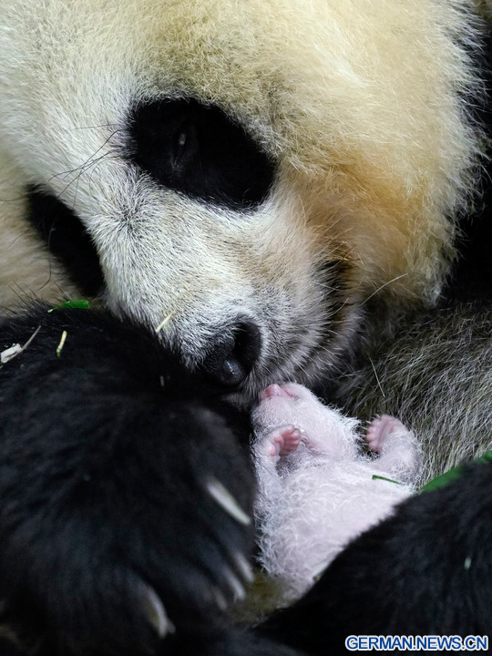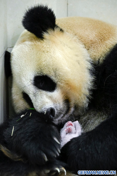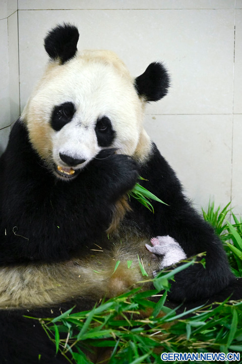 WOLONG, 18. August 2022 (Xinhua) -- Das Foto zeigt die Riesenpandadame Cuicui und ihr Jungtier am Panda-Standort Shenshuping des China Conservation and Research Center for Giant Panda im Wolong-Nationalpark in der Provinz Sichuan im Südwesten Chinas, 6. August 2022. Ein weibliches Riesenpanda-Jungtier mit einem Gewicht von 270,4 Gramm ist das schwerste in Gefangenschaft geborene Panda-Jungtier der Welt, das jemals erfasst wurde, teilte das Panda-Forschungszentrum am Mittwoch mit. Cuicui, eine 16-jährige Pandadame, brachte das Jungtier am 5. August um 21.39 Uhr Ortszeit am Panda-Standort Shenshuping im Wolong-Nationalpark zur Welt und brach damit den bisherigen Gewichtsrekord von 249 Gramm eines 2021 geborenen Pandas. (Foto von Wei Rongping/Xinhua)