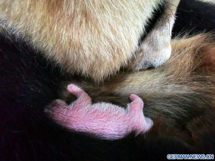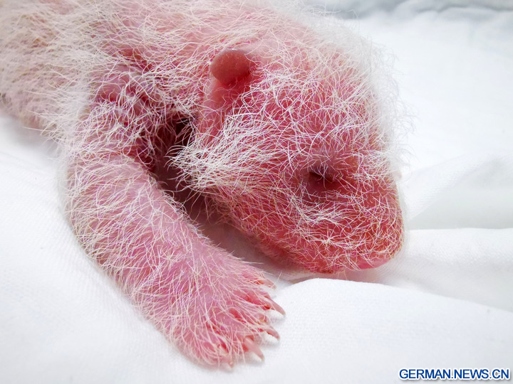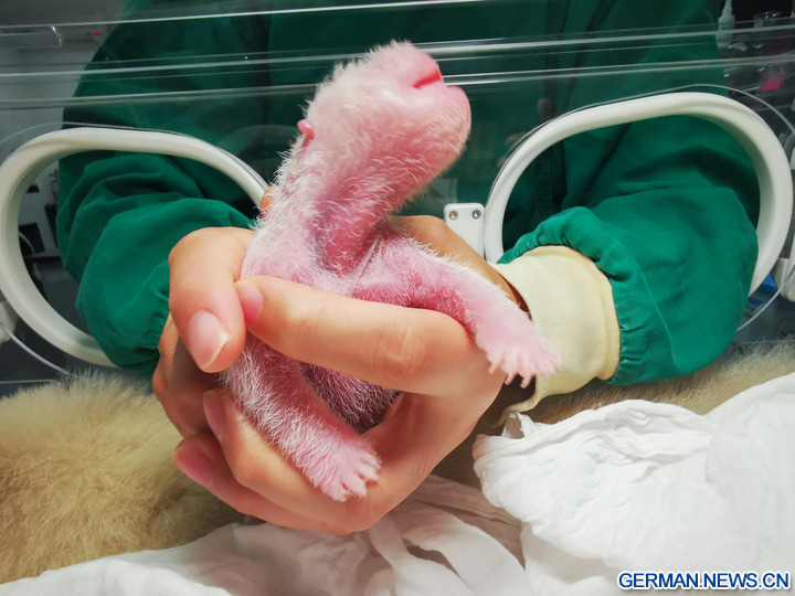 WOLONG, 18. August 2022 (Xinhua) -- Das Foto zeigt das neugeborene Riesenpanda-Jungtier am Panda-Standort Shenshuping des China Conservation and Research Center for Giant Panda im Wolong-Nationalpark in der Provinz Sichuan im Südwesten Chinas, 6. August 2022. Ein weibliches Riesenpanda-Jungtier mit einem Gewicht von 270,4 Gramm ist das schwerste in Gefangenschaft geborene Panda-Jungtier der Welt, das jemals erfasst wurde, teilte das Panda-Forschungszentrum am Mittwoch mit. Cuicui, eine 16-jährige Pandadame, brachte das Jungtier am 5. August um 21.39 Uhr Ortszeit am Panda-Standort Shenshuping im Wolong-Nationalpark zur Welt und brach damit den bisherigen Gewichtsrekord von 249 Gramm eines 2021 geborenen Pandas. (Foto von Wei Rongping/Xinhua)
