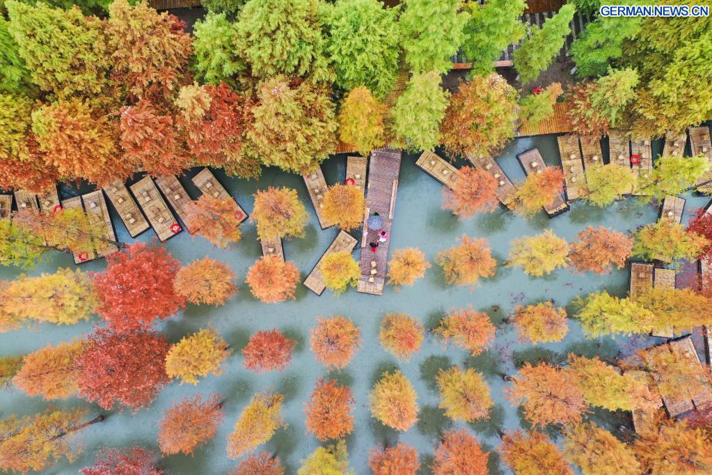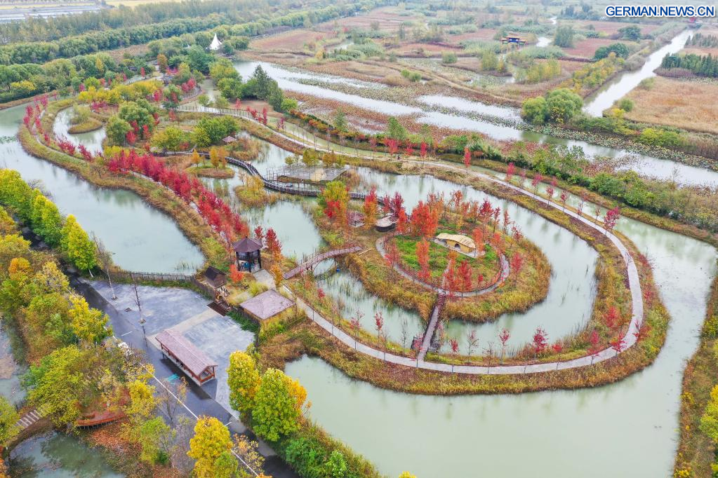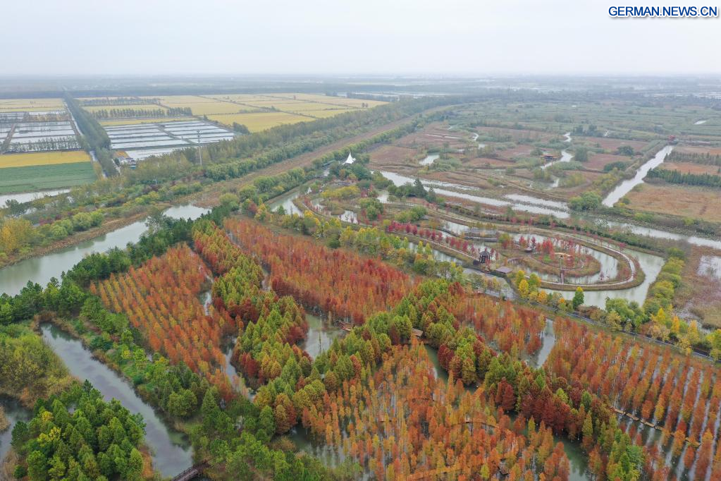 SIHONG, 26. Oktober 2022 (Xinhuanet) -- Dieses am 26. Oktober 2022 aufgenommene Luftbild zeigt die Herbstlandschaft des Landschaftlichen Feuchtgebiets Hongze-See im Kreis Sihong der ostchinesischen Provinz Jiangsu. (Quelle: Xinhua/Ji Chunpeng)