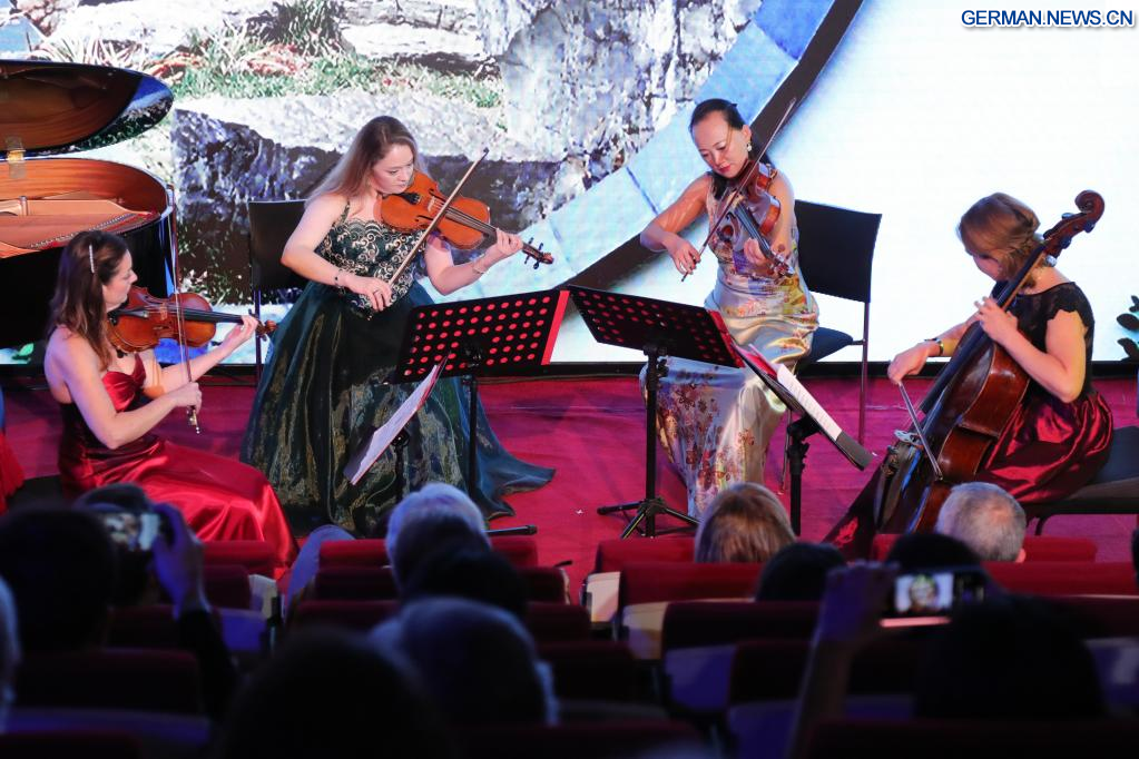 BRÜSSEL, 30. Oktober 2022 (Xinhuanet) -- Künstlerinnen eines Streichquartetts spielen während eines Kammerkonzerts mit dem Titel "Melodie des Orients" in Brüssel, Belgien, 29. Oktober 2022. (Quelle: Xinhua/Zheng Huansong)