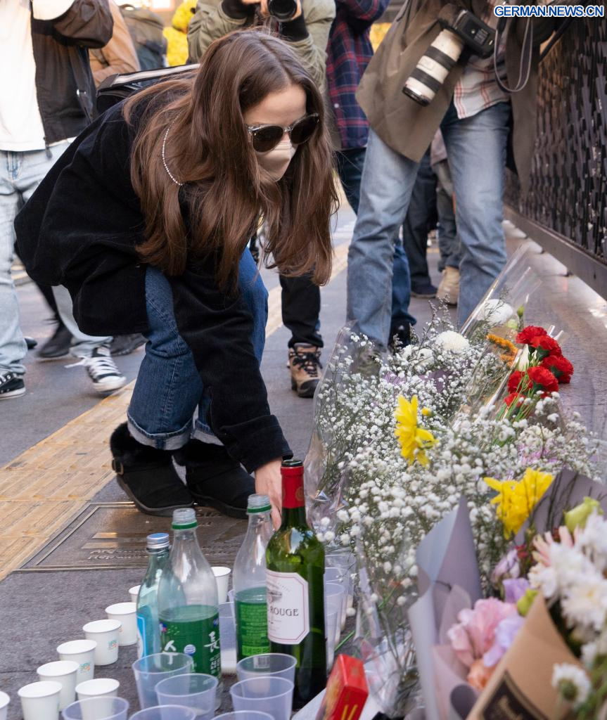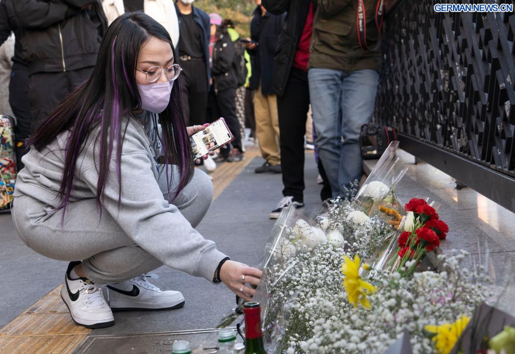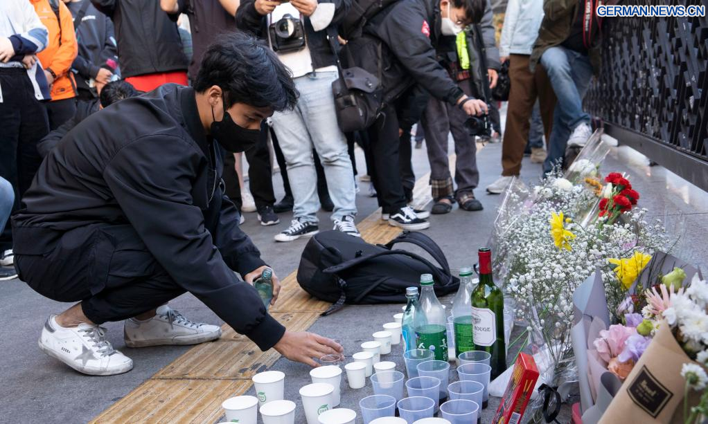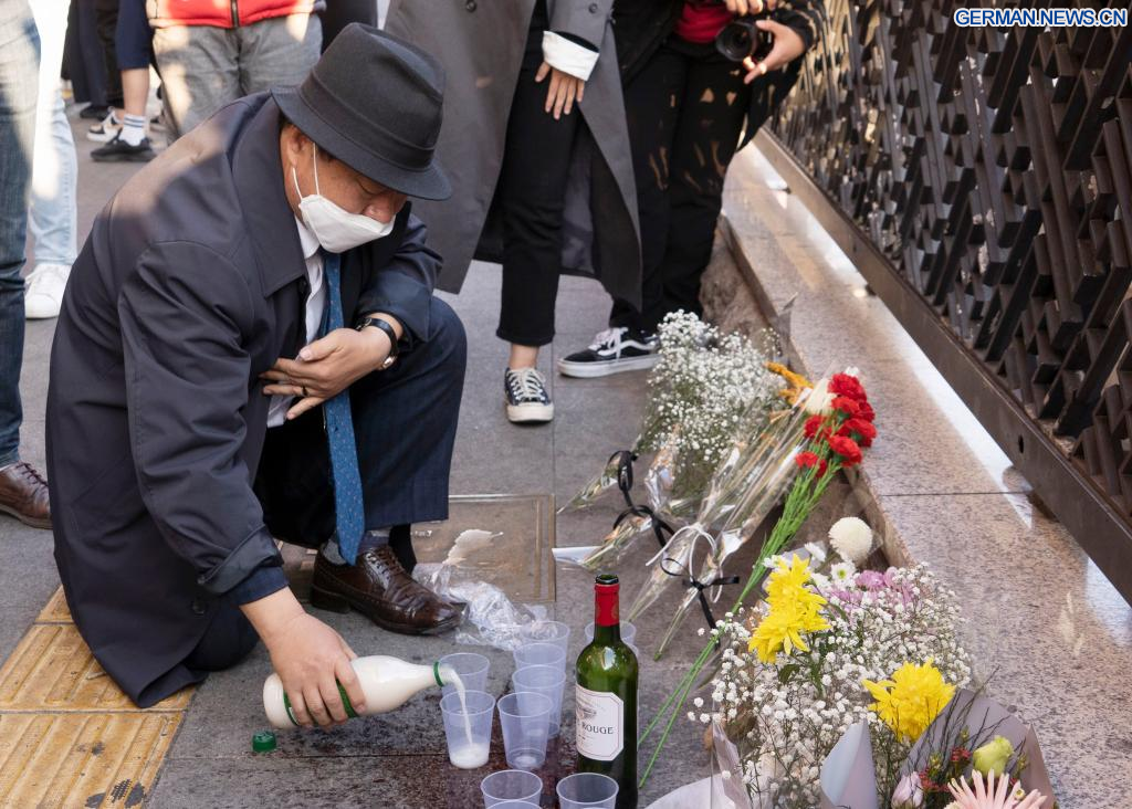 SEOUL, 30. Oktober 2022 (Xinhuanet) -- Menschen trauern um die Opfer eines tödlichen Massengedränges in Itaewon, einem Bezirk in Seoul, Südkorea, 30. Oktober 2022. Mindestens 153 Menschen wurden getötet und 103 weitere verletzt bei einem Massengedränge, das sich am Samstagabend im Bezirk Itaewon in Seoul während der Halloween-Versammlungen ereignete, wie die örtlichen Behörden am Sonntag mitteilten. (Foto von James Lee/Xinhua)