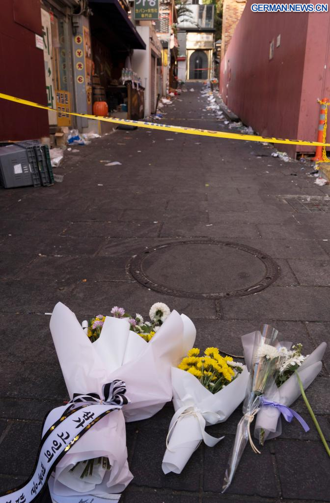 SEOUL, 30. Oktober 2022 (Xinhuanet) -- Blumen sind für die Opfer eines tödlichen Massengedränges in Itaewon, einem Bezirk in Seoul, Südkorea, niedergelegt worden, 30. Oktober 2022. Mindestens 153 Menschen wurden getötet und 103 weitere verletzt bei einem Massengedränge, das sich am Samstagabend im Bezirk Itaewon in Seoul während der Halloween-Versammlungen ereignete, wie die örtlichen Behörden am Sonntag mitteilten. (Foto von James Lee/Xinhua)