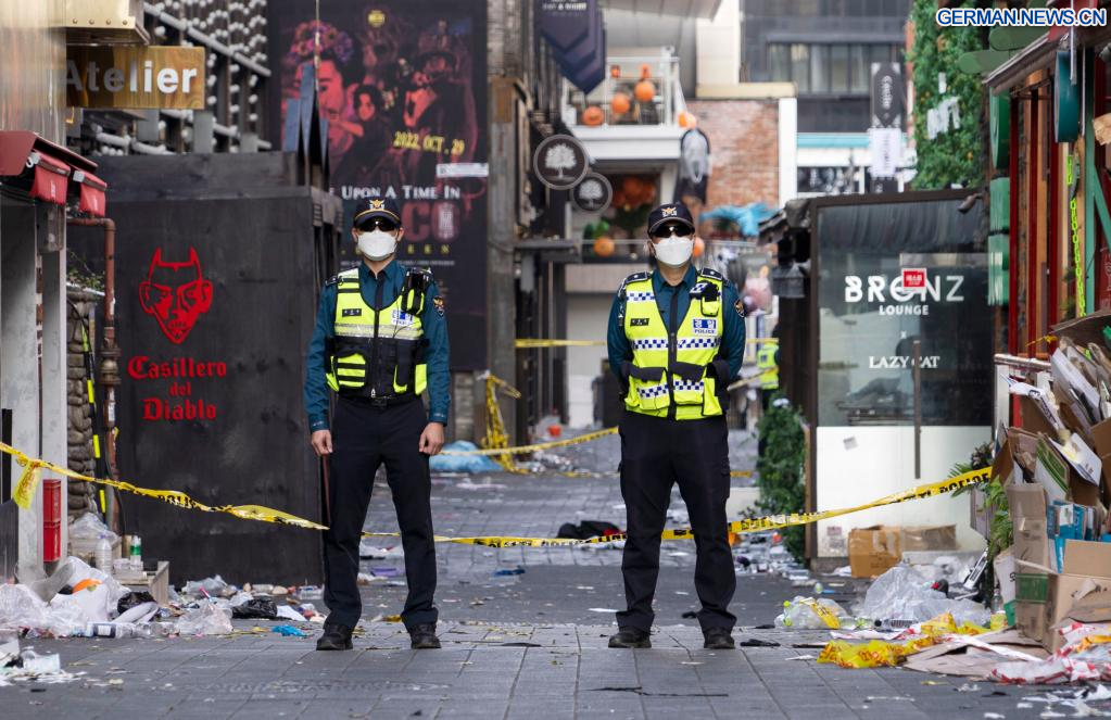SEOUL, 30. Oktober 2022 (Xinhuanet) -- Polizeibeamte stehen Wache am Ort eines tödlichen Massengedränges in Itaewon, einem Bezirk in Seoul, Südkorea, 30. Oktober 2022. Mindestens 153 Menschen wurden getötet und 103 weitere verletzt bei einem Massengedränge, das sich am Samstagabend im Bezirk Itaewon in Seoul während der Halloween-Versammlungen ereignete, wie die örtlichen Behörden am Sonntag mitteilten. (Foto von James Lee/Xinhua)