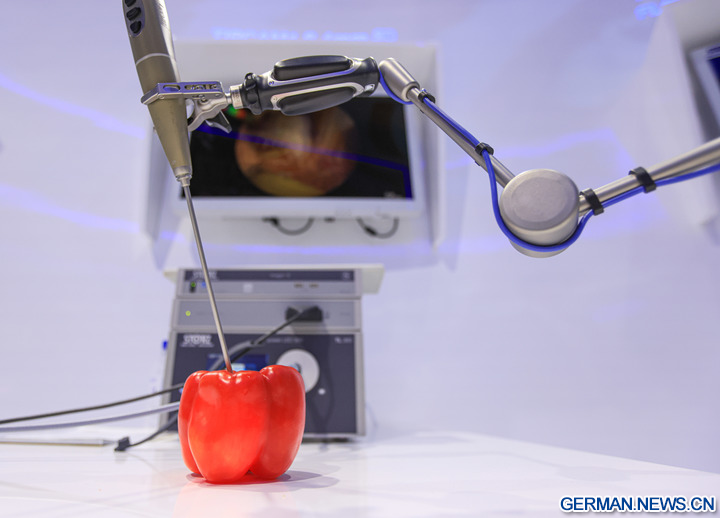SHANGHAI, 9. November 2022 (Xinhua) -- Das Foto zeigt ein elektronisches Endoskop auf der 5. Internationalen Importmesse Chinas (CIIE) in Shanghai an der Ostküste Chinas, 7. November 2022. Hightech-Produkte und -Technologien, die sich auf die Verbesserung der visuellen Wahrnehmung in den Bereichen Arbeit, Reisen und Unterhaltung konzentrieren, wie zum Beispiel ein intelligentes Cockpit und ein mikroskopisches Bildgebungsgerät, bieten den Besuchern auf der 5. CIIE in Shanghai eine lebendige und reichhaltige visuelle Erfahrung. (Xinhua/Li Jing)