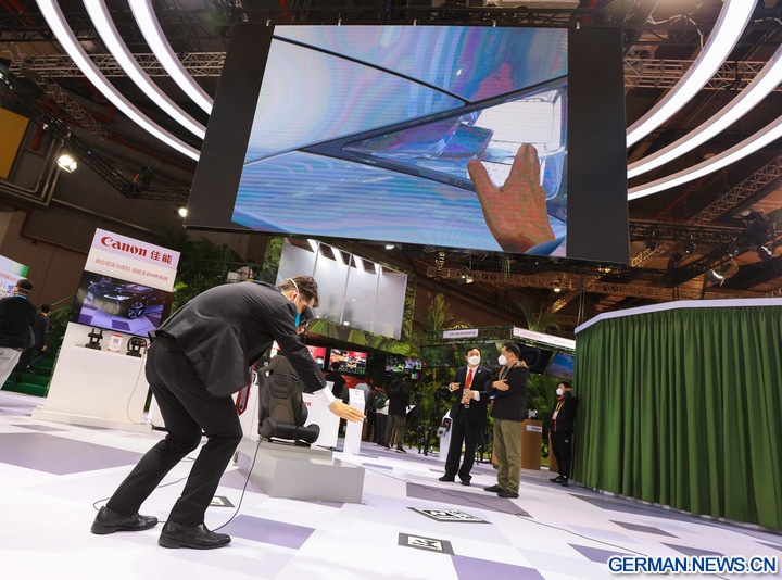 SHANGHAI, 9. November 2022 (Xinhua) -- Ein Aussteller demonstriert ein Mixed Reality (MR) System am Messestand von Canon auf der 5. Internationalen Importmesse Chinas (CIIE) in Shanghai an der Ostküste Chinas, 7. November 2022. Hightech-Produkte und -Technologien, die sich auf die Verbesserung der visuellen Wahrnehmung in den Bereichen Arbeit, Reisen und Unterhaltung konzentrieren, wie zum Beispiel ein intelligentes Cockpit und ein mikroskopisches Bildgebungsgerät, bieten den Besuchern auf der 5. CIIE in Shanghai eine lebendige und reichhaltige visuelle Erfahrung. (Xinhua/Li Jing)