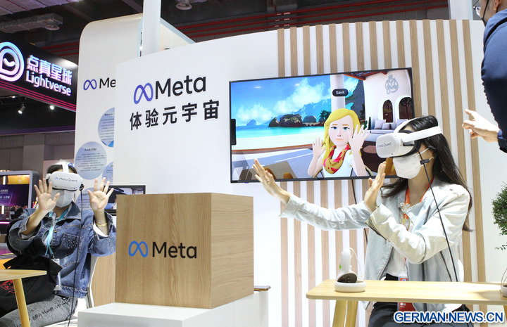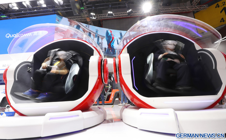 SHANGHAI, 9. November 2022 (Xinhua) -- Besucher testen ein interaktives Spiel mit Virtual-Reality (VR)-Geräten im Ausstellungsbereich für intelligente Industrie und Informationstechnologie der 5. Internationalen Importmesse Chinas (CIIE) in Shanghai an der Ostküste Chinas, 7. November 2022. Hightech-Produkte und -Technologien, die sich auf die Verbesserung der visuellen Wahrnehmung in den Bereichen Arbeit, Reisen und Unterhaltung konzentrieren, wie zum Beispiel ein intelligentes Cockpit und ein mikroskopisches Bildgebungsgerät, bieten den Besuchern auf der 5. CIIE in Shanghai eine lebendige und reichhaltige visuelle Erfahrung. (Xinhua/Hou Jun)