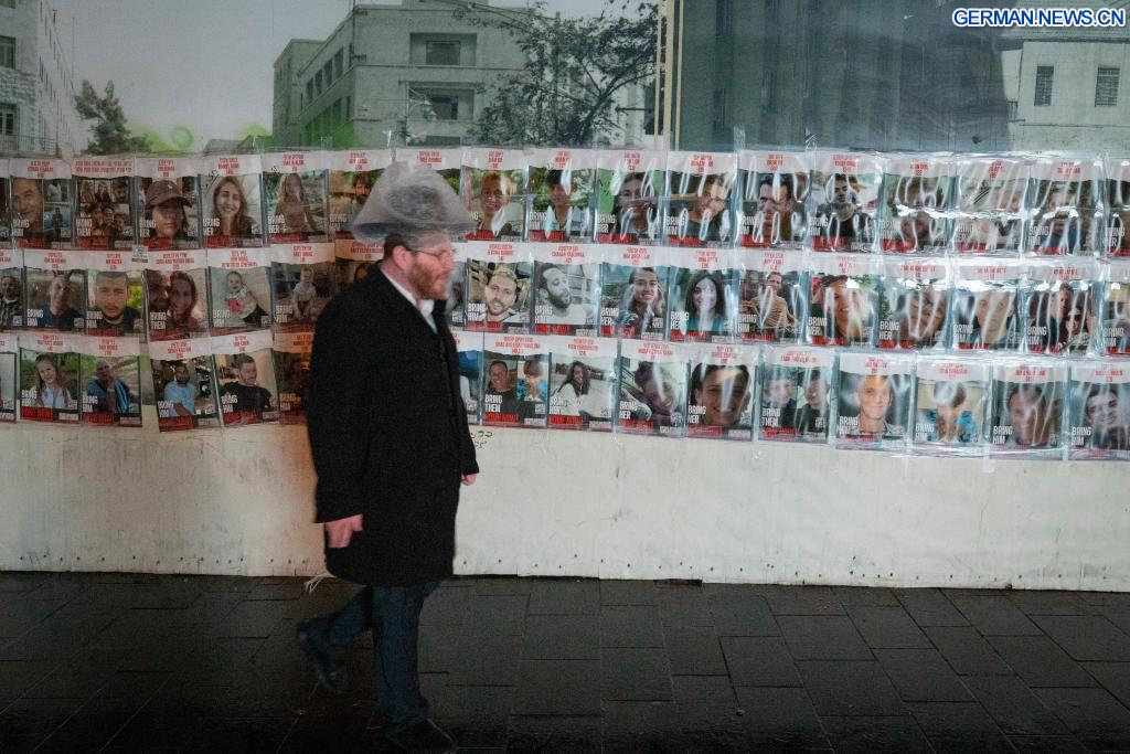 JERUSALEM, 27. November 2023 (Xinhuanet) -- Ein Mann geht in Jerusalem an Plakaten von israelischen Geiseln, die in Gaza festgehalten werden, vorbei, 27. November 2023. Die Hamas hat am Montag die vierte Gruppe von in Gaza festgehaltenen israelischen Geiseln freigelassen, und es wird erwartet, dass in den kommenden Tagen weitere freigelassen werden, da Israel und die Hamas vereinbart haben, den derzeitigen Waffenstillstand um zwei weitere Tage zu verlängern. (Quelle: Xinhua/Chen Junqing)