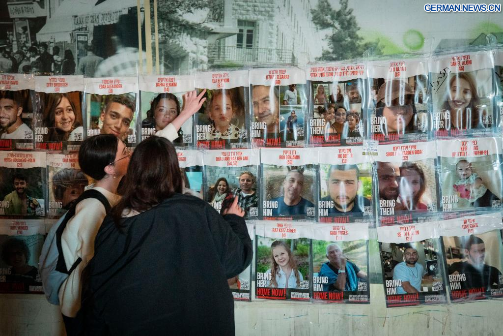 JERUSALEM, 27. November 2023 (Xinhuanet) -- Menschen betrachten in Jerusalem die Plakate von israelischen Geiseln, die in Gaza festgehalten werden, 27. November 2023. Die Hamas hat am Montag die vierte Gruppe von in Gaza festgehaltenen israelischen Geiseln freigelassen, und es wird erwartet, dass in den kommenden Tagen weitere freigelassen werden, da Israel und die Hamas vereinbart haben, den derzeitigen Waffenstillstand um zwei weitere Tage zu verlängern. (Quelle: Xinhua/Chen Junqing)