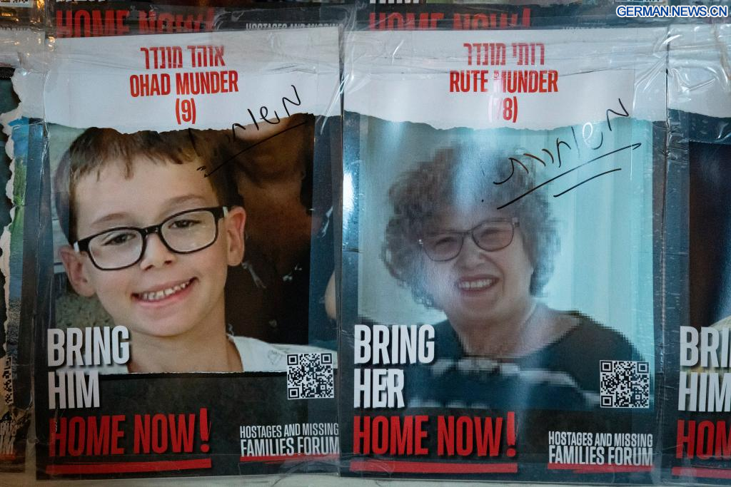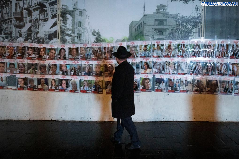 JERUSALEM, 27. November 2023 (Xinhuanet) -- Ein Mann betrachtet in Jerusalem die Plakate von israelischen Geiseln, die in Gaza festgehalten werden, 27. November 2023. Die Hamas hat am Montag die vierte Gruppe von in Gaza festgehaltenen israelischen Geiseln freigelassen, und es wird erwartet, dass in den kommenden Tagen weitere freigelassen werden, da Israel und die Hamas vereinbart haben, den derzeitigen Waffenstillstand um zwei weitere Tage zu verlängern. (Quelle: Xinhua/Chen Junqing)
