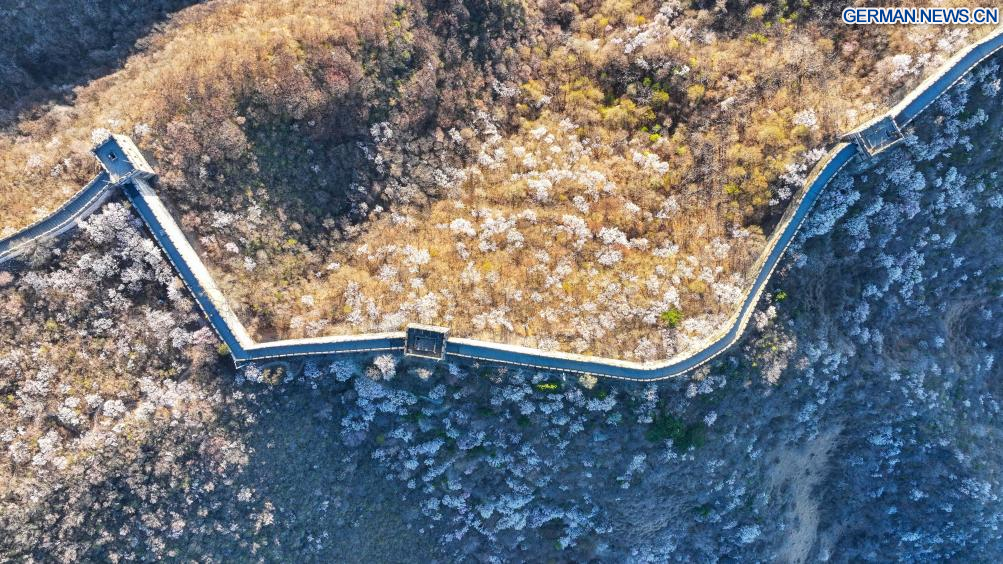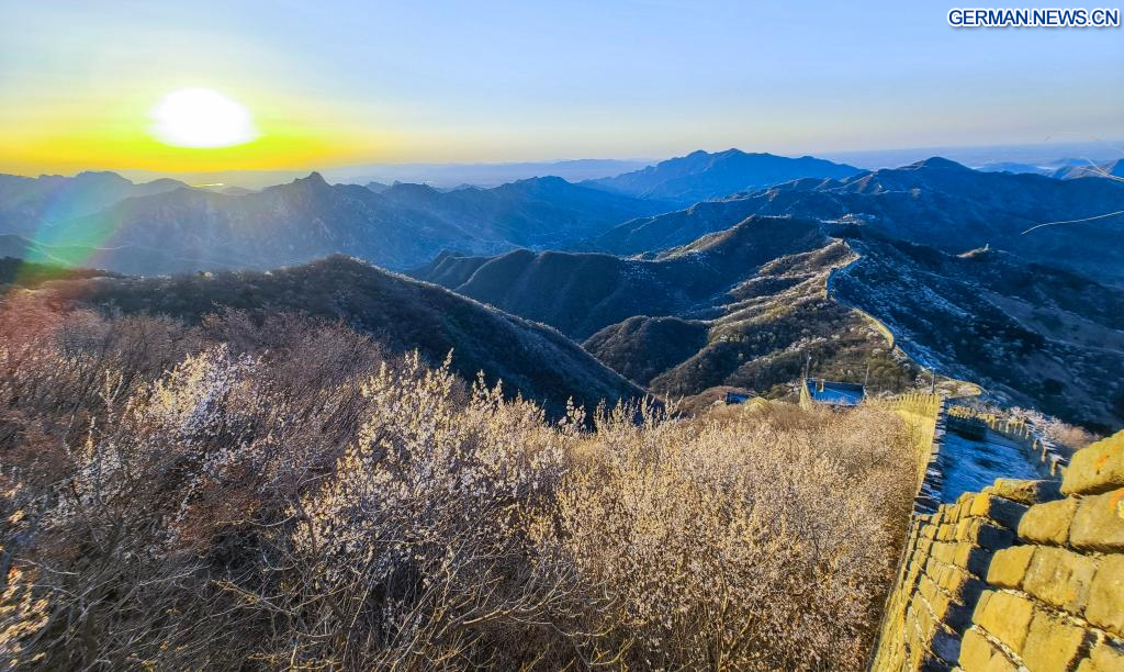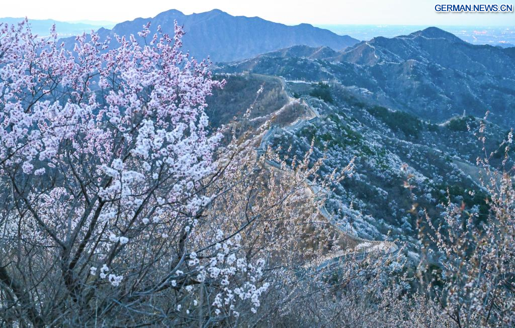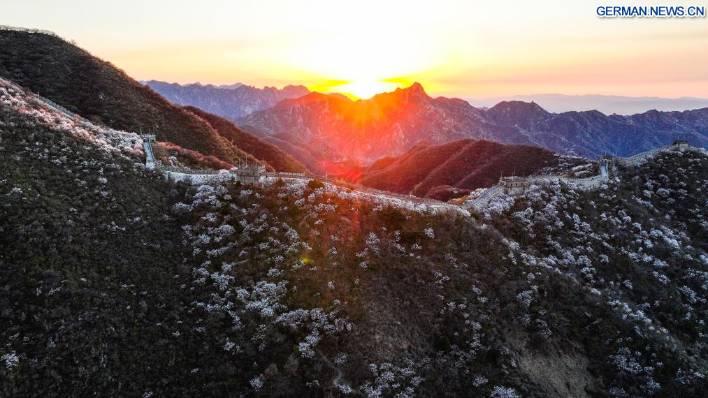 BEIJING, 5. April 2025 (Xinhuanet) -- Das am 5. April 2025 aufgenommene Foto zeigt den Mutianyu-Abschnitt der Großen Mauer in Chinas Hauptstadt Beijing in der Morgendämmerung. Die Abschnitte Mutianyu und Jiankou der Großen Mauer sind beliebte Reiseziele von Bergwanderern und Fotografen. Wenn der Frühling kommt, verleihen die kilometerlangen Baumblüten der majestätischen Großen Mauer einen Hauch von Zärtlichkeit. (Quelle: Xinhua/Chen Yehua)