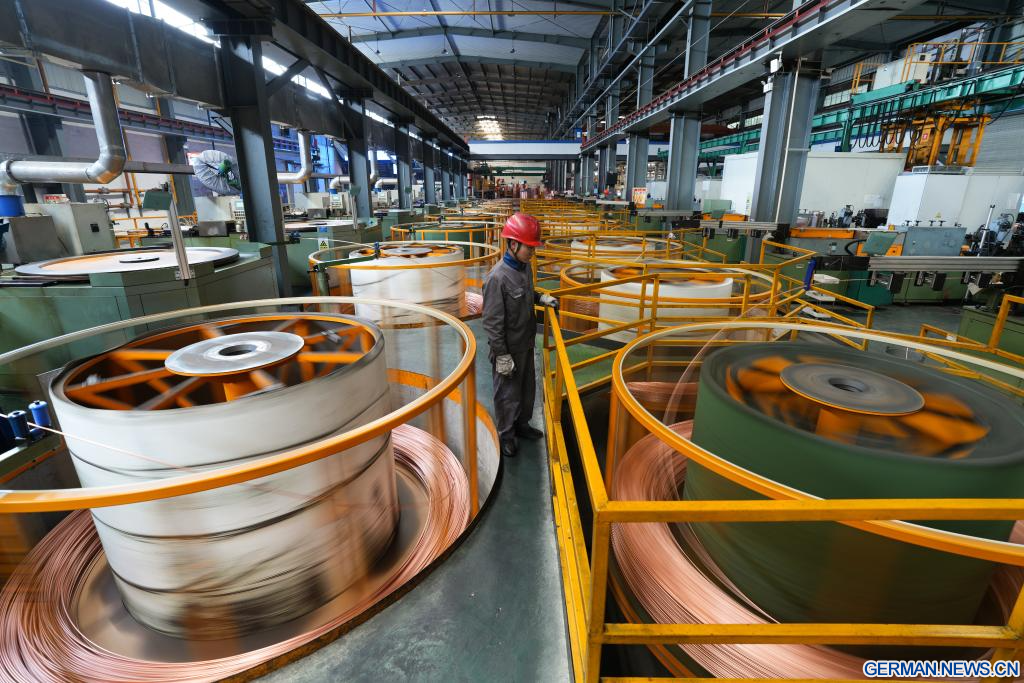 ZHUJI, 7. April 2025 (Xinhuanet) -- Ein Arbeiter prüft eine Rolle Kupferrohr bei Zhejiang Hailiang Limited in der Gemeinde Diankou in Zhuji in der ostchinesischen Provinz Zhejiang, 7. April 2025. (Quelle: Xinhua/Weng Xinyang)