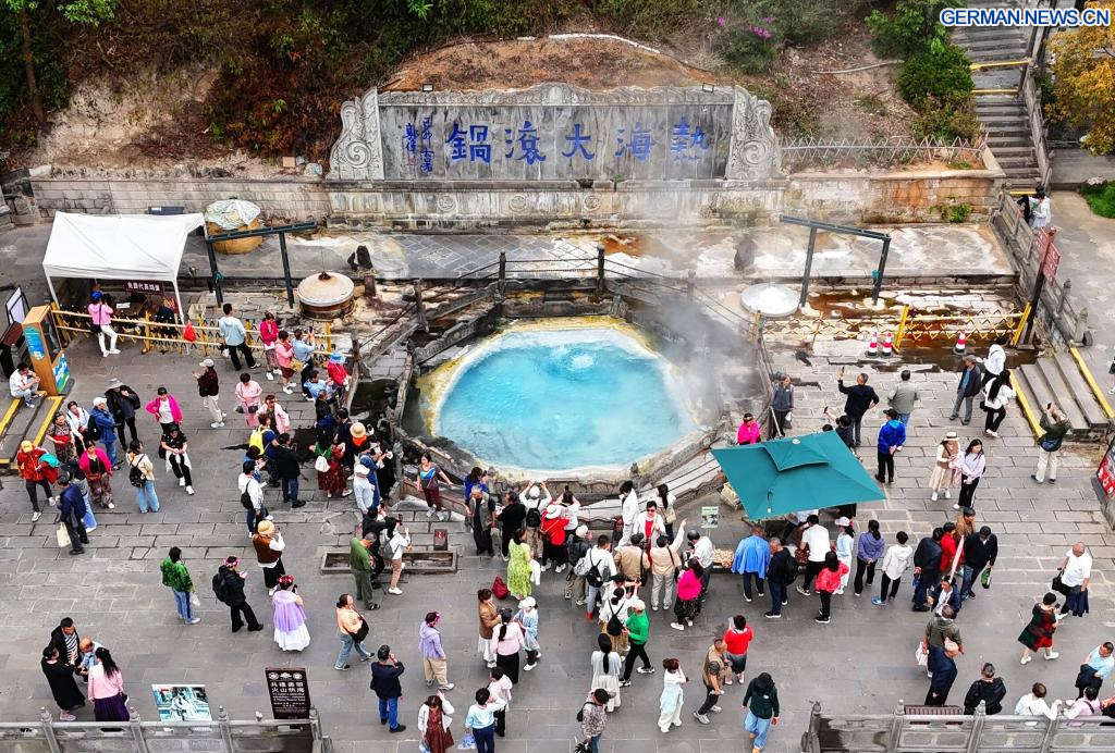 TENGCHONG, 29. April 2025 (Xinhuanet) -- Die Luftaufnahme einer Drohne vom 23. April 2025 zeigt Menschen, die eine heiße Quelle in Tengchong in der südwestchinesischen Provinz Yunnan besuchen. Tengchong beherbergt 99 aktive und erloschene Vulkane und ist reich an geothermischen Ressourcen. Die Umgebung der Stadt ist bei Einheimischen als „halb Wasser, halb Feuer“ bekannt, eine Besonderheit, die für die Entwicklung des Tourismus genutzt wird. (Foto von Zhao Hui/Xinhua)
