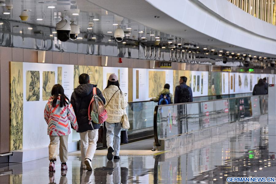 Passagiere gehen durch einen „Kunstkorridor“ am internationalen Flughafen Beijing Daxing in der chinesischen Hauptstadt Beijing, 4. Januar 2025. (Xinhua/Li Xin)