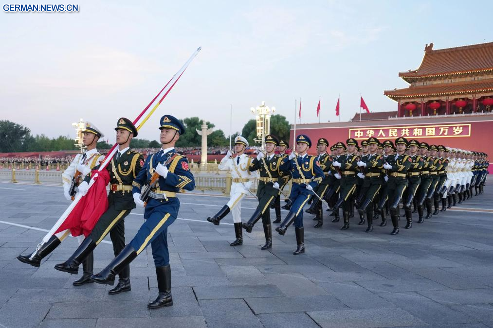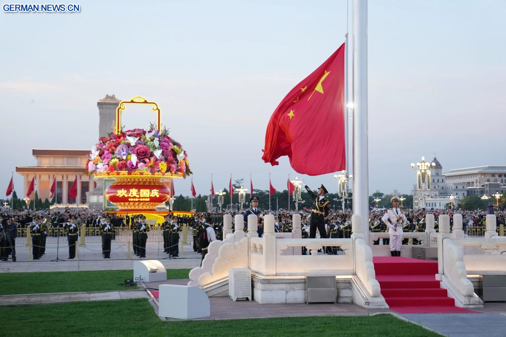 BEIJING, 1. Oktober 2025 (Xinhuanet) -- Ein zeremonielles Hissen der Flagge anlässlich des 76. Jahrestages der Gründung der Volksrepublik China findet auf dem Tian'anmen-Platz in Chinas Hauptstadt Beijing statt, 1. Oktober 2025. (Quelle: Xinhua/Ju Huanzong)