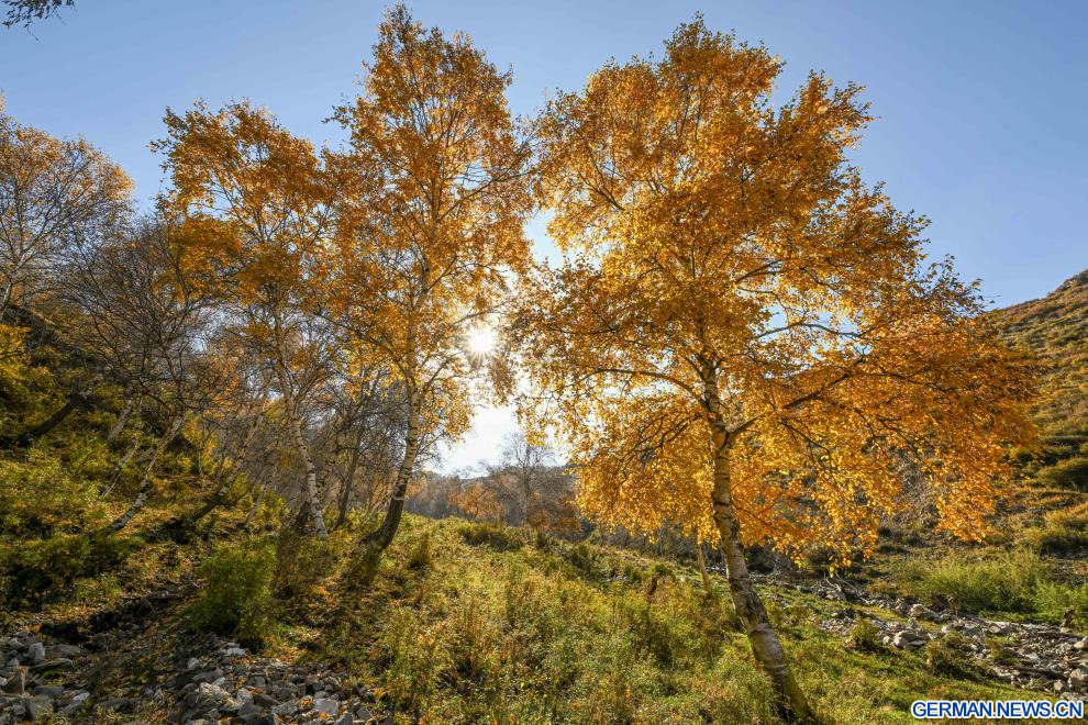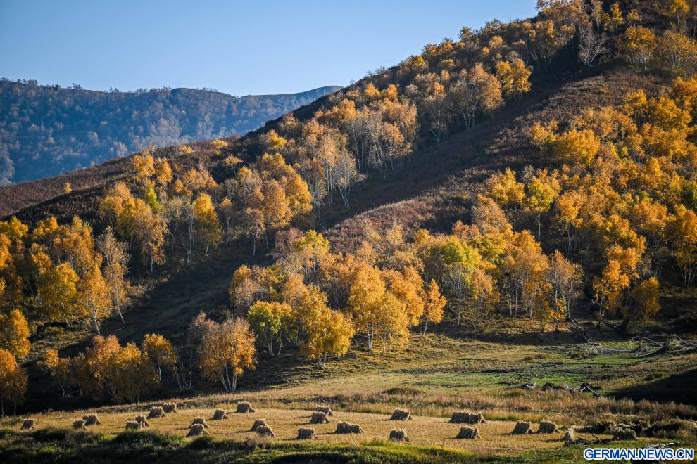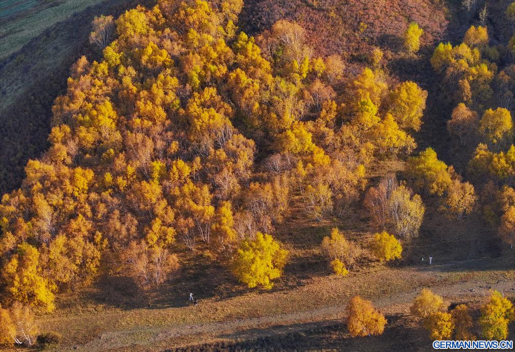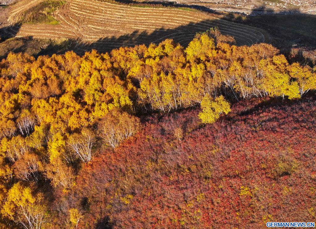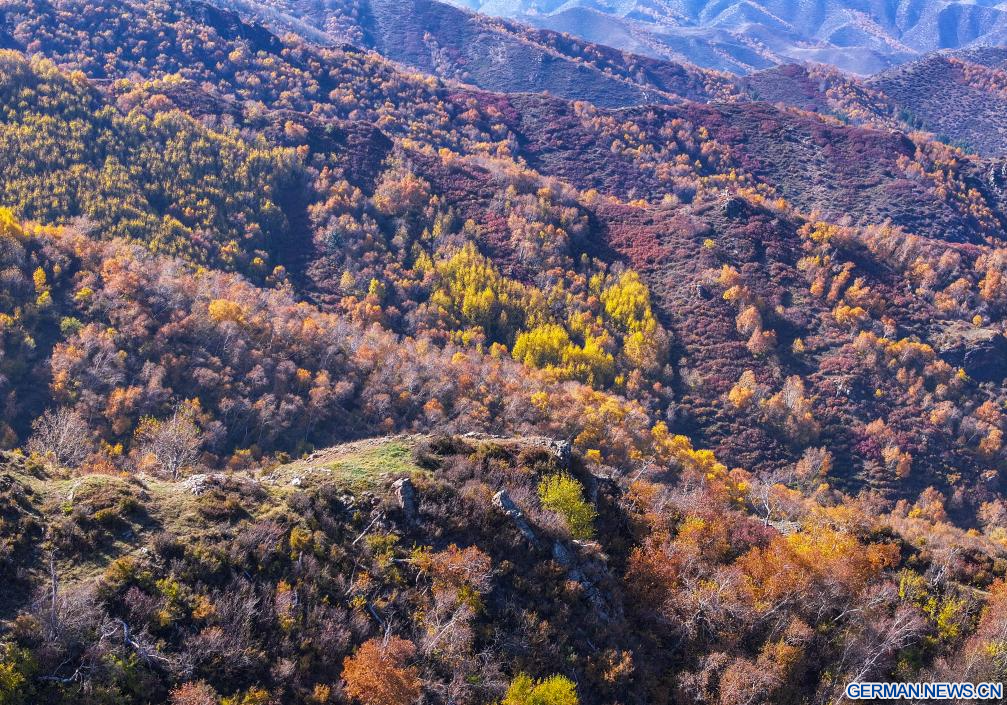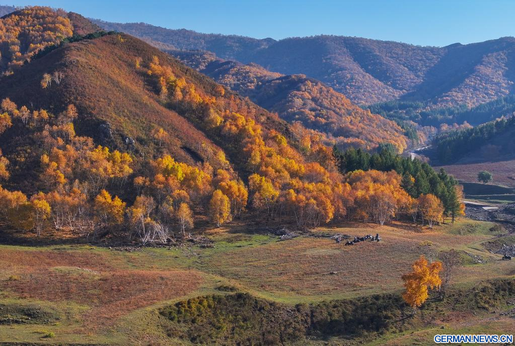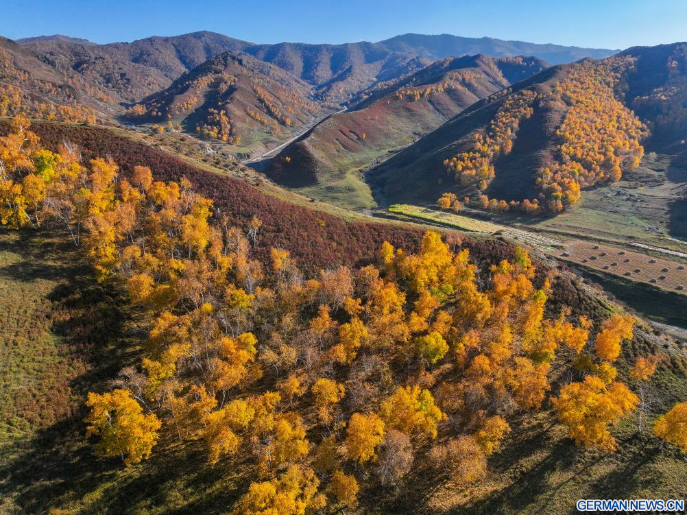 HOHHOT, 2. Oktober 2025 (Xinhuanet) -- Die Luftaufnahme einer Drohne vom 2. Oktober 2025 zeigt die Herbstlandschaft des Nationalen Naturschutzgebiets Daqingshan in Hohhot in der Autonomen Region Innere Mongolei im Norden Chinas. (Quelle: Xinhua/Lian Zhen)