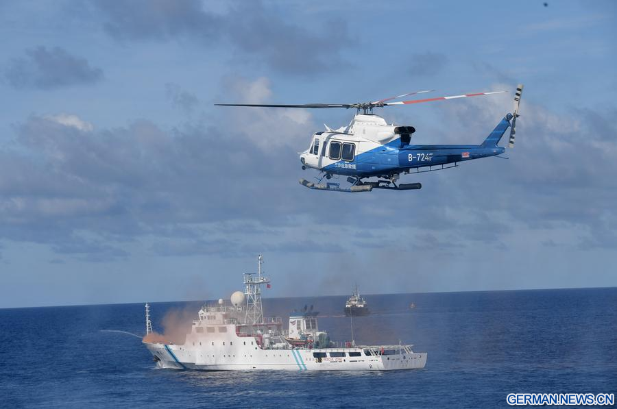 In den Gewässern nahe der Insel Yongxing der Inselgruppe Xisha Qundao in der südchinesischen Provinz Hainan findet eine umfassende Seenotrettungsübung der Stadt Sansha statt, 26. Juni 2025. (Xinhua/Zhao Yingquan)