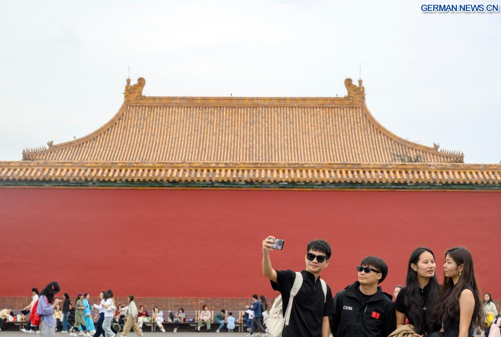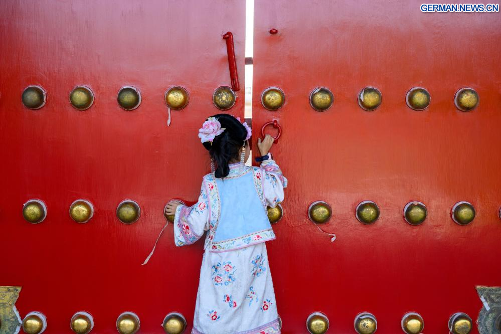 BEIJING, 4. Oktober 2025 (Xinhuanet) -- Ein kleines Mädchen in traditioneller Tracht ist im Palastmuseum in der chinesischen Hauptstadt Beijing zu sehen, 2. Oktober 2025. In diesem Jahr wird der 100. Jahrestag der Gründung des chinesischen Palastmuseums, auch bekannt als Verbotene Stadt, begangen.