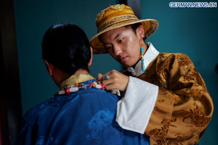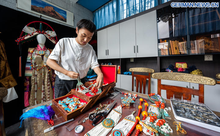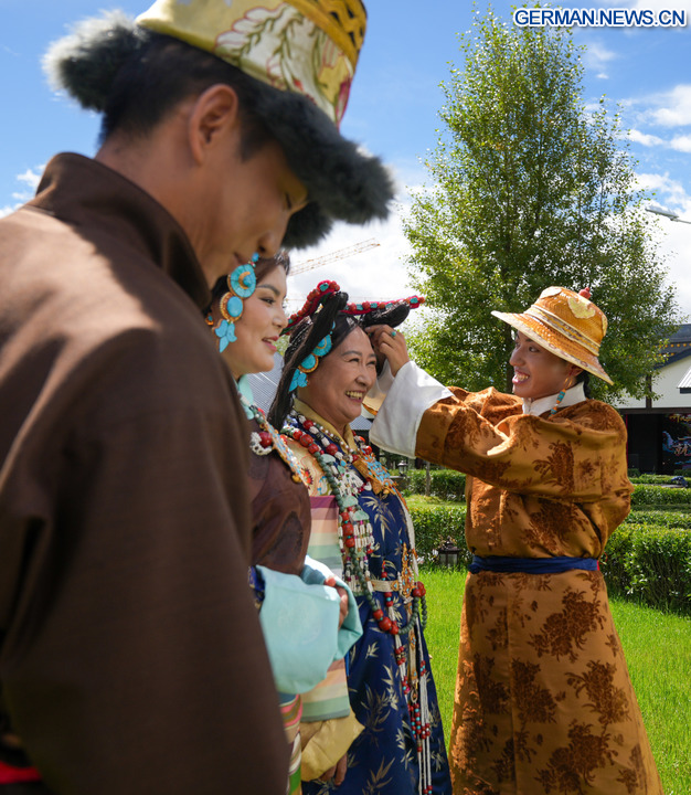 LHASA, 5. Oktober 2025 (Xinhua) -- Padruk Tendar (rechts) passt in Lhasa im Autonomen Gebiet Xizang im Südwesten Chinas tibetische Kostümaccessoires für ein Model an, 9. September 2025. Padruk Tendar ist seit seiner Kindheit stark von traditionellen tibetischen Kunstformen wie Oper und Thangka-Malerei beeinflusst. Er lässt sich bei seinen Farben von Wandmalereien und Thangkas inspirieren und verwendet moderne Stoffe, um die tibetische Ästhetik neu zu beleben und den Kleidungsstücken sowohl klassischen Charme als auch zeitgenössischen Stil zu verleihen. Seine Entwürfe wurden nicht nur bei Festlichkeiten in Xizang gezeigt, sondern auch auf internationalen Kulturbühnen präsentiert. (Xinhua/Zhang Xiaoyu)