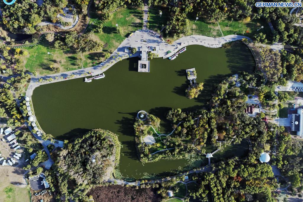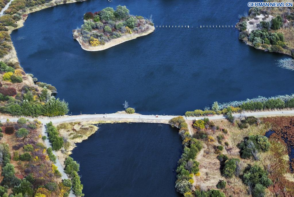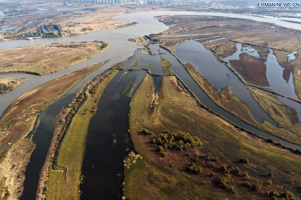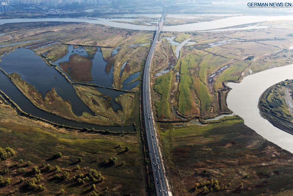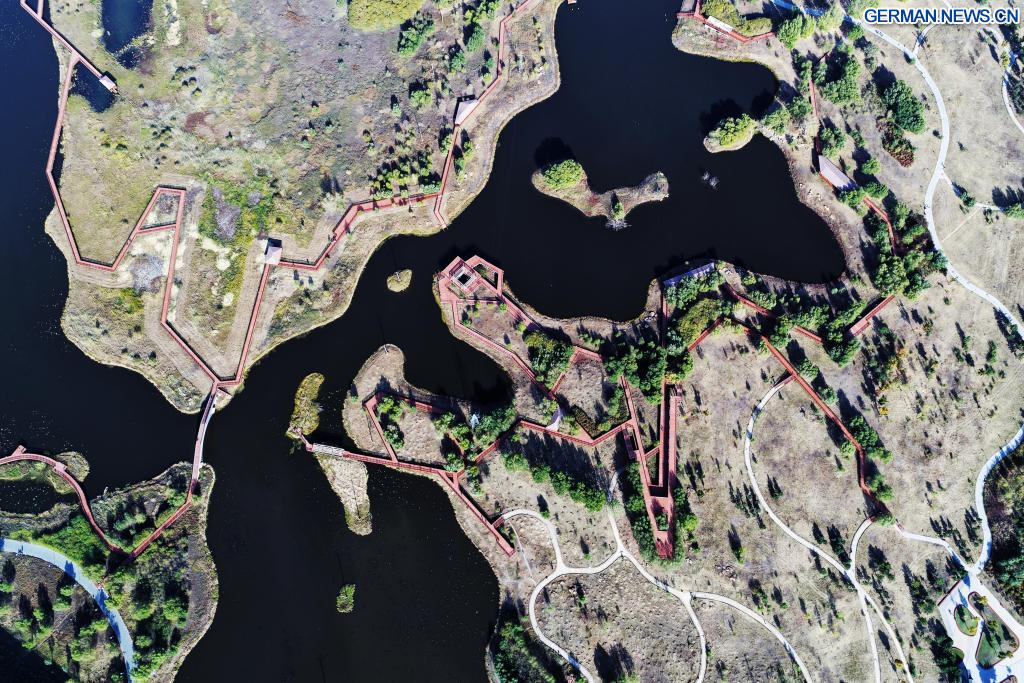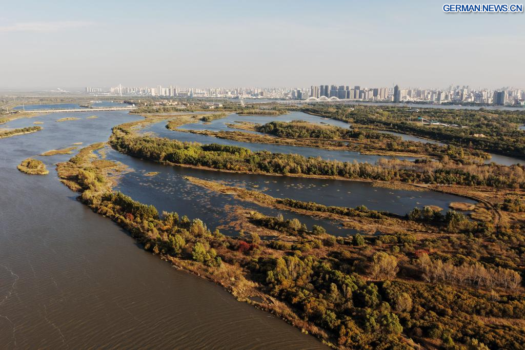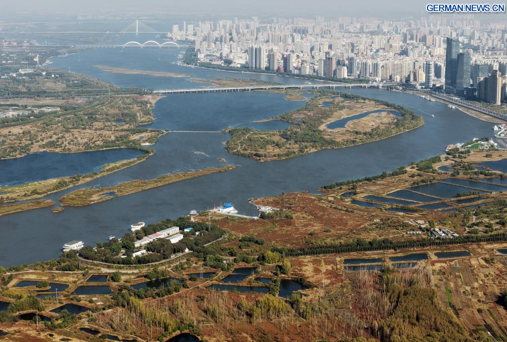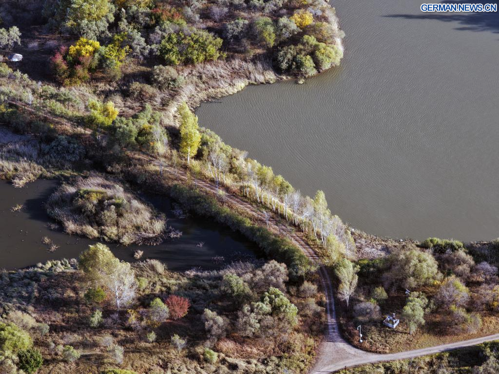HARBIN, 8. Oktober 2025 (Xinhua) -- Die Luftaufnahme einer Drohne vom 7. Oktober 2025 zeigt die Herbstlandschaft des Jinhewan-Feuchtgebietsparks in Harbin in der nordostchinesischen Provinz Heilongjiang. Mit zahlreichen Feuchtgebieten hat Harbin intensiv an der Errichtung von Feuchtgebiet-Tourismusgebieten für Ferienreisen gearbeitet, um seine einzigartigen natürlichen und historischen Ressourcen zu nutzen. (Quelle: Xinhua/Wang Song)