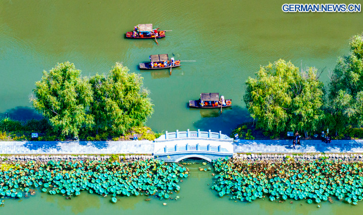 BEIJING, 8. Oktober 2025 (Xinhua) -- Die Drohnenaufnahme zeigt Touristen beim Bootfahren im Lixiahe National Wetland Park in der Stadt Xinghua in der Provinz Jiangsu in Ostchina, 7. Oktober 2025. Auch zum Ende der Ferienzeit zum Nationalfeiertag und zum Mondfest ist die Begeisterung der Touristen im ganzen Land ungebrochen. (Foto von Zhou Shegen/Xinhua)