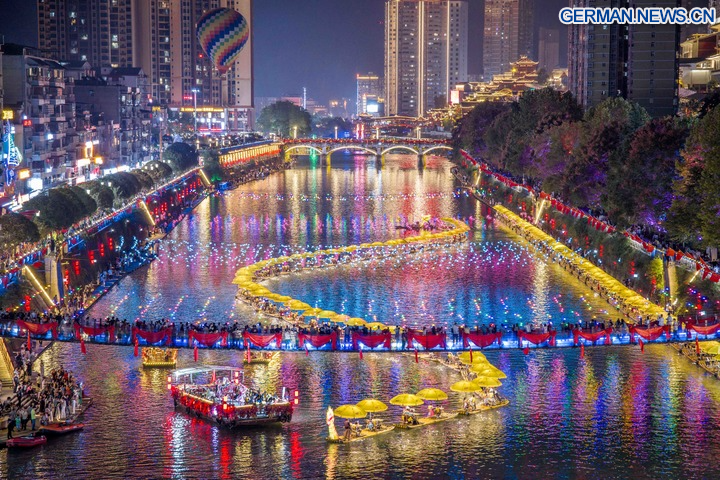 BEIJING, 8. Oktober 2025 (Xinhua) -- Die Drohnenaufnahme zeigt Touristen beim Bewundern der Nachtkulisse im Kreis Xuan'en in der Provinz Hubei in Zentralchinas, 6. Oktober 2025. Auch zum Ende der Ferienzeit zum Nationalfeiertag und zum Mondfest ist die Begeisterung der Touristen im ganzen Land ungebrochen. (Foto von Wang Fajun/Xinhua)