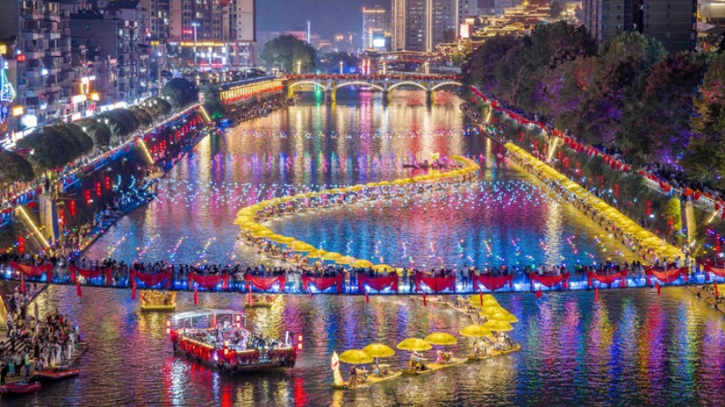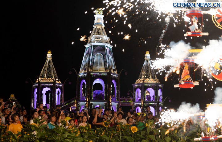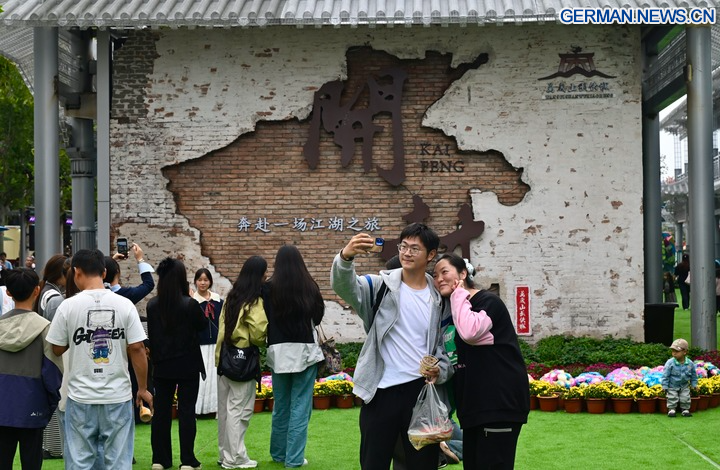 BEIJING, 8. Oktober 2025 (Xinhua) -- Touristen besuchen die Wansui Mountain Martial Arts City in der Stadt Kaifeng in der Provinz Henan in Zentralchina, 7. Oktober 2025. Auch zum Ende der Ferienzeit zum Nationalfeiertag und zum Mondfest ist die Begeisterung der Touristen im ganzen Land ungebrochen. (Xinhua/Hao Yuan)