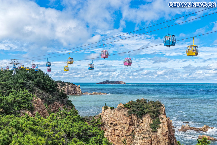 BEIJING, 8. Oktober 2025 (Xinhua) -- Die Drohnenaufnahme zeigt Touristen bei der Fahrt mit einer Seilbahn an einem landschaftlich reizvollen Ort in Rongcheng in der Provinz Shandong in Ostchina, 7. Oktober 2025. Auch zum Ende der Ferienzeit zum Nationalfeiertag und zum Mondfest ist die Begeisterung der Touristen im ganzen Land ungebrochen. (Foto von Li Xinjun/Xinhua)