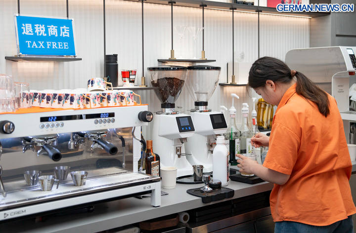 HANGZHOU, 8. Oktober 2025 (Xinhua) -- Das Foto zeigt ein „Tax Free”-Schild in einem Geschäft in Zhangyuan, auch bekannt als Zhang-Garten, in Shanghai in Ostchina, 20. Juli 2025.