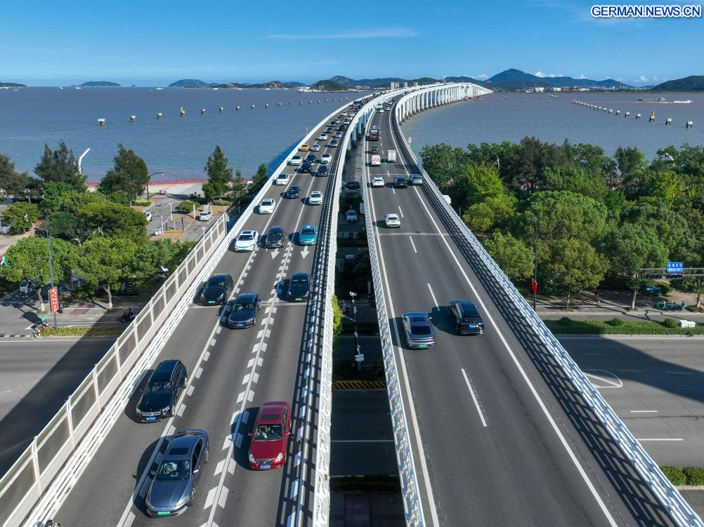 BEIJING, 9. Oktober 2025 (Xinhuanet) -- Die Luftaufnahme einer Drohne vom 7. Oktober 2025 zeigt Fahrzeuge, die auf einer Brücke in der Stadt Zhoushan in der ostchinesischen Provinz Zhejiang fahren. (Foto von Zou Xunyong/Xinhua)