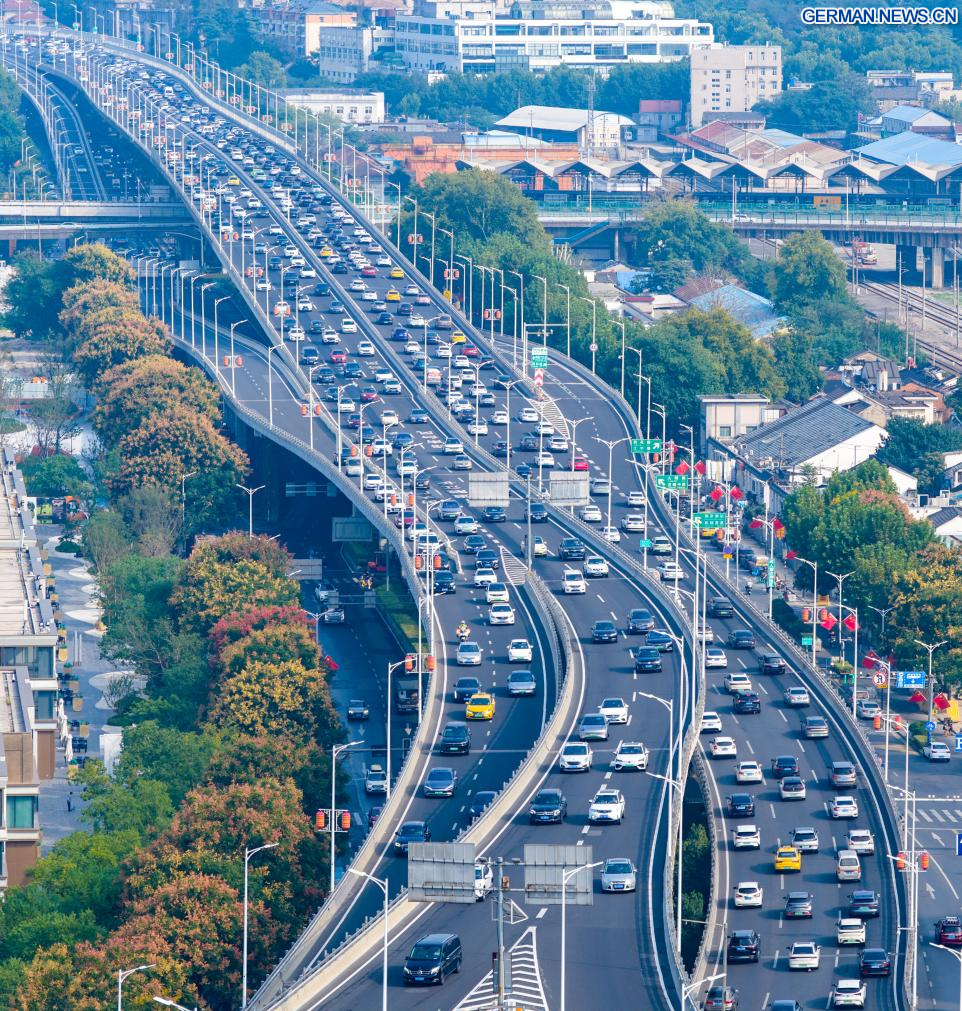 BEIJING, 9. Oktober 2025 (Xinhuanet) -- Die Luftaufnahme einer Drohne vom 7. Oktober 2025 zeigt Fahrzeuge auf Straßen in Nanjing in der ostchinesischen Provinz Jiangsu. Während der achttägigen Ferien zum Nationalfeiertag und Mondfest, die am Mittwoch endeten, wurden laut Angaben des Verkehrsministeriums vom Donnerstag landesweit etwa 2,43 Milliarden interregionale Passagierfahrten verzeichnet.