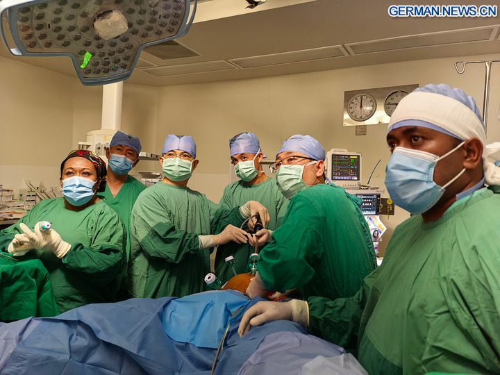 SUVA, 9. Oktober 2025 (Xinhua) -- Das Foto zeigt chinesische Ärzte vom Hospitalschiff „Silk Road Ark“ der chinesischen Marine sowie lokale Ärzte bei einer Operation an einem Patienten in einem örtlichen Krankenhaus in Suva in Fidschi, 6. Oktober 2025.