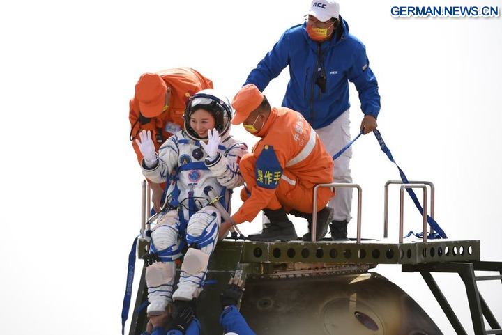 Das Foto zeigt die Astronautin Wang Yaping nach dem Ausstieg aus der Rückkehrkapsel des Raumschiffs „Shenzhou-13“ am Landeplatz Dongfeng in der Autonomen Region Innere Mongolei in Nordchina, 16. April 2022. (Xinhua/Peng Yuan)