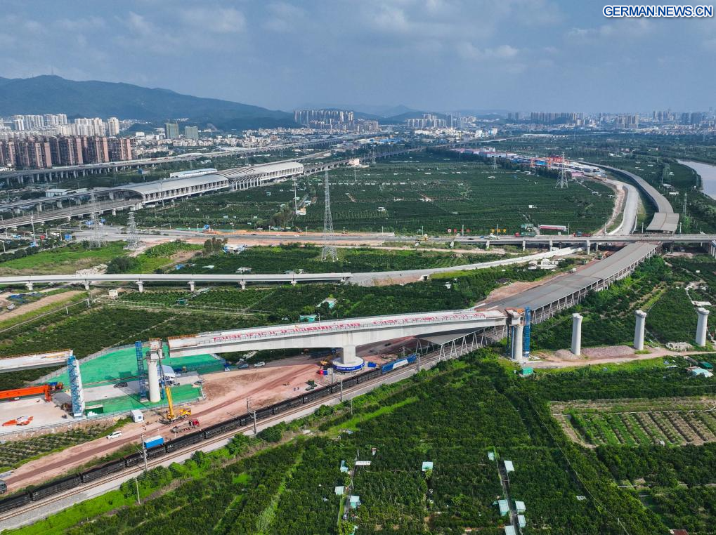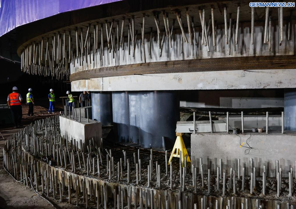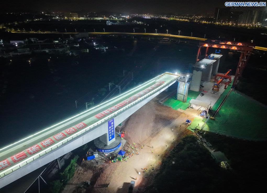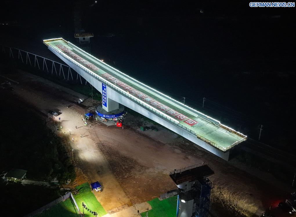 Die 11.216 Tonnen schwere Brücke, die sich über 160 Meter über eine Güterbahnlinie erstreckt, wurde am Freitagmorgen erfolgreich in die vorgesehene Position gedreht. (Quelle: Xinhua/Liu Dawei)