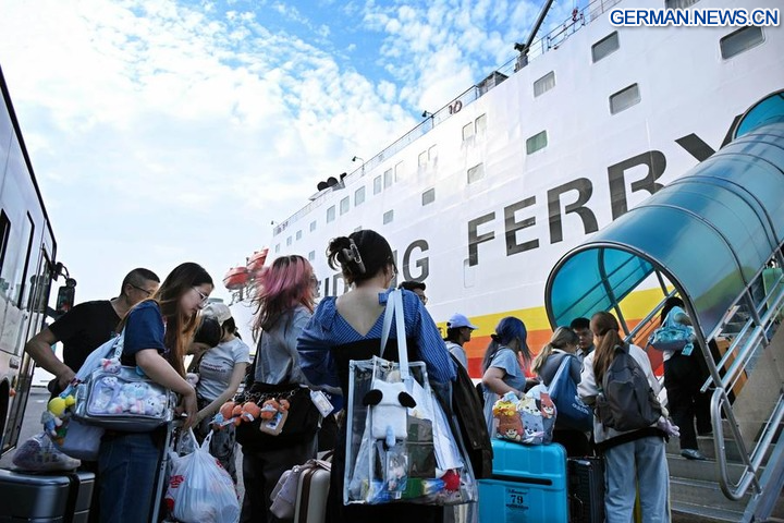 Passagiere warten in einer Schlange, um an Bord eines Passagier- und Frachtschiffs an einem Kai des Kreuzfahrtterminals von Qingdao in der ostchinesischen Provinz Shandong zu gehen, 1. Oktober 2025. (Xinhua/Li Ziheng)