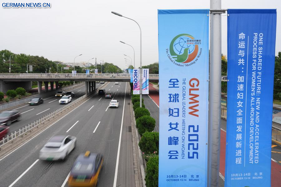 Das Foto zeigt Straßenbanner für das Global Leaders' Meeting on Women in der chinesischen Hauptstadt Beijing, 12. Oktober 2025. (Xinhua/Xu Bingjie)