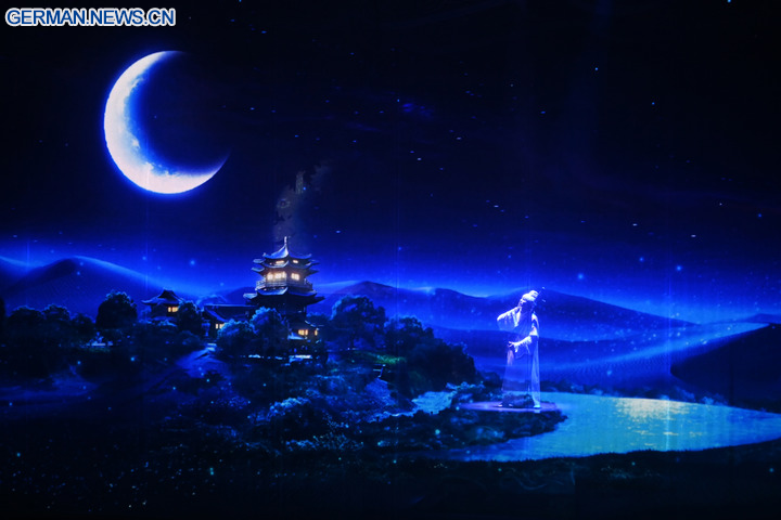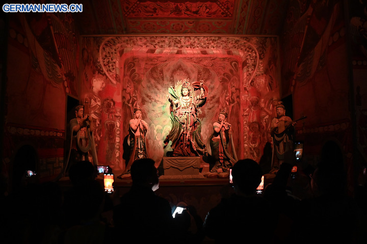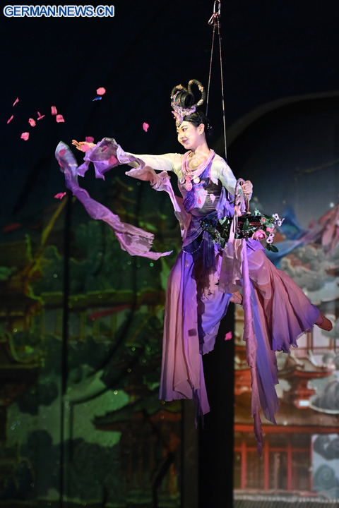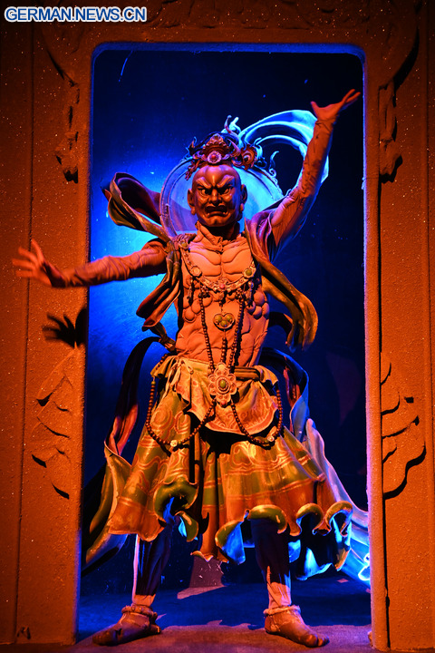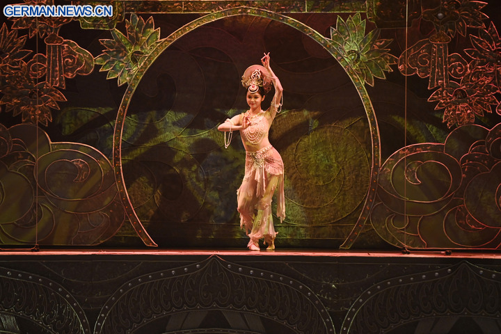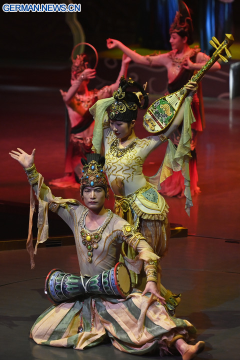 DUNHUANG, 14. Oktober 2025 (Xinhua) -- Eine immersive Theateraufführung mit dem Titel „Ancient Sound of Dunhuang“ wird für Gäste des Global Mayors Dialogue Dunhuang-Events in Dunhuang in der Provinz Gansu im Nordwesten Chinas aufgeführt, 12. Oktober 2025. (Xinhua/Fan Peishen)
